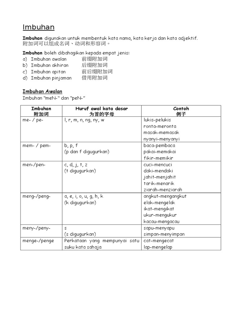 Imbuhan dapat dibahagikan kepada beberapa kumpulan seperti yang berikut: Imbuhan awalan ialah imbuhan yang berada di hadapan kata akar, contohnya pe(n), me(n), ter dan sebagainya. Carta imbuhan bagi kata kerja,tatabahasa tahun 5: Ada 4 jenis kata majmuk : Kata nama menerima empat jenis imbuhan: